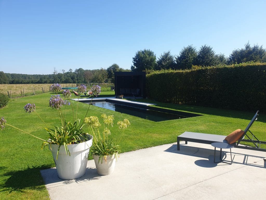 Een landschapsvijver moet naadloos in het landschap overgaan. Deze landschapsvijver geeft de indruk dat hij op een natuurlijke manier ontstaan is. Gigantisch, organisch en speels … Om geen afleidingen te hebben van het mooie, donkere wateroppervlak is de boord opgetrokken uit een discreet grasprofiel in cortenstaal. Deze siervijver heeft een volume van 500.000L. Zuivering: 2…