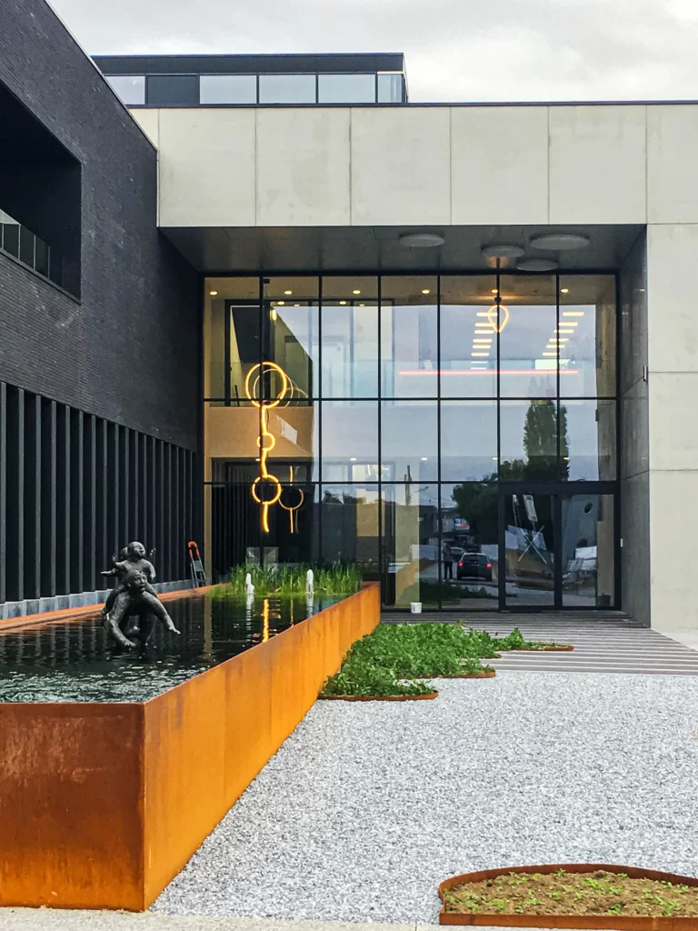 Een waterpartij brengt rust. Devagro koos voor een strakke waterpartij voor hun gebouw. De weerspiegeling van hun gebouw op het wateroppervlak is een echte eyecatcher.