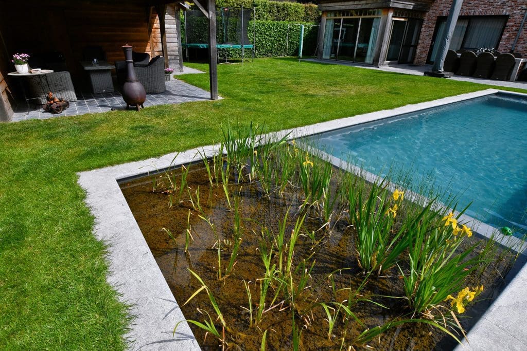 Deze doe-het-zelver bouwde zijn eigen hybride zwemvijver. Hij heeft alle kwaliteiten om je naar het platteland in Zuid-Frankrijk te vervoeren. Het ontwerp past mooi bij de landelijke stijl van de woning en het poolhouse. De plantenzone wordt opgevrolijkt door gele lis.
