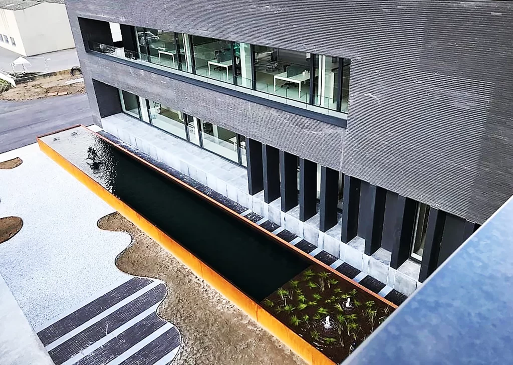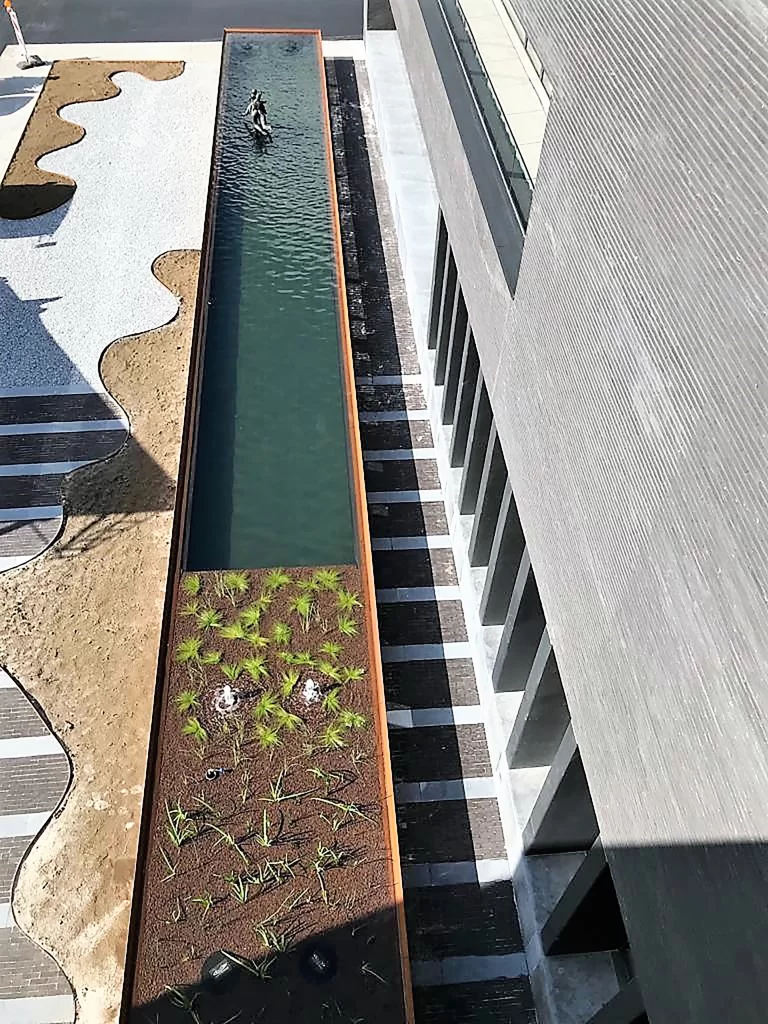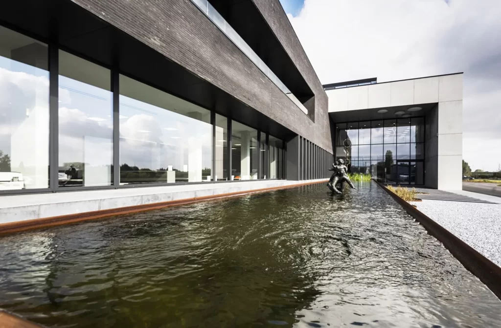 Een waterpartij brengt rust. Devagro koos voor een strakke waterpartij voor hun gebouw. De weerspiegeling van hun gebouw op het wateroppervlak is een echte eyecatcher.